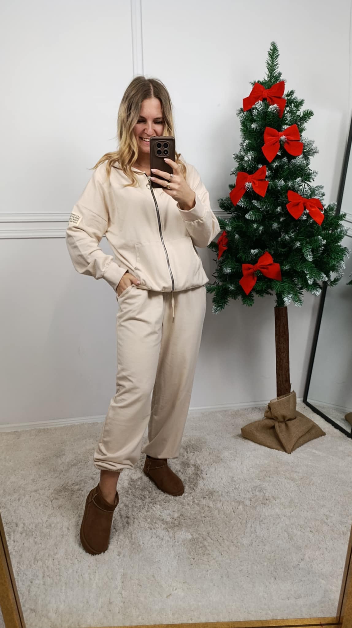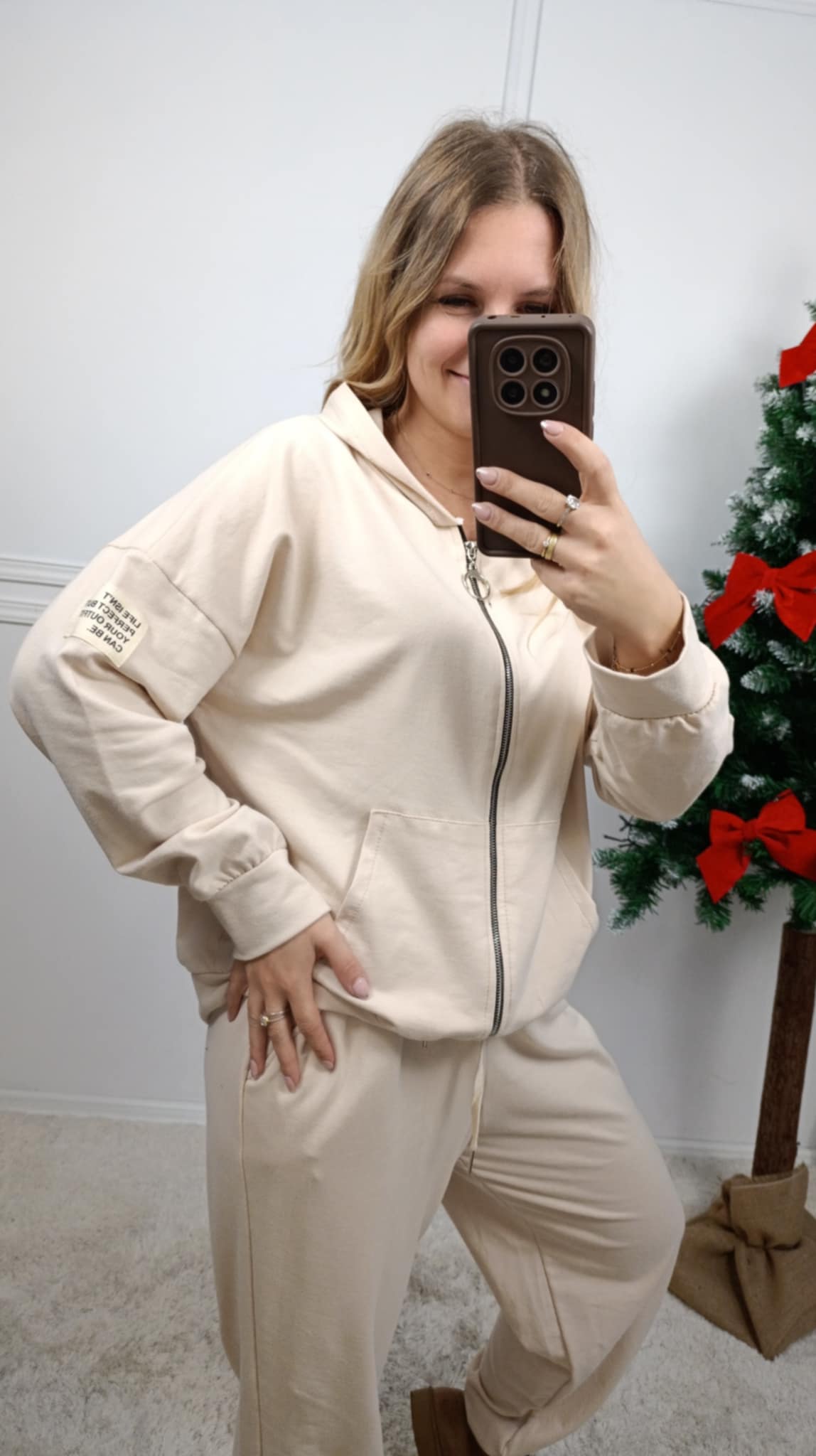 Komplet damski złożony z bluzy z kapturem zapinanej na suwak oraz spodni na gumce z dodatkowym wiązaniem i wykończonych ściągaczem.