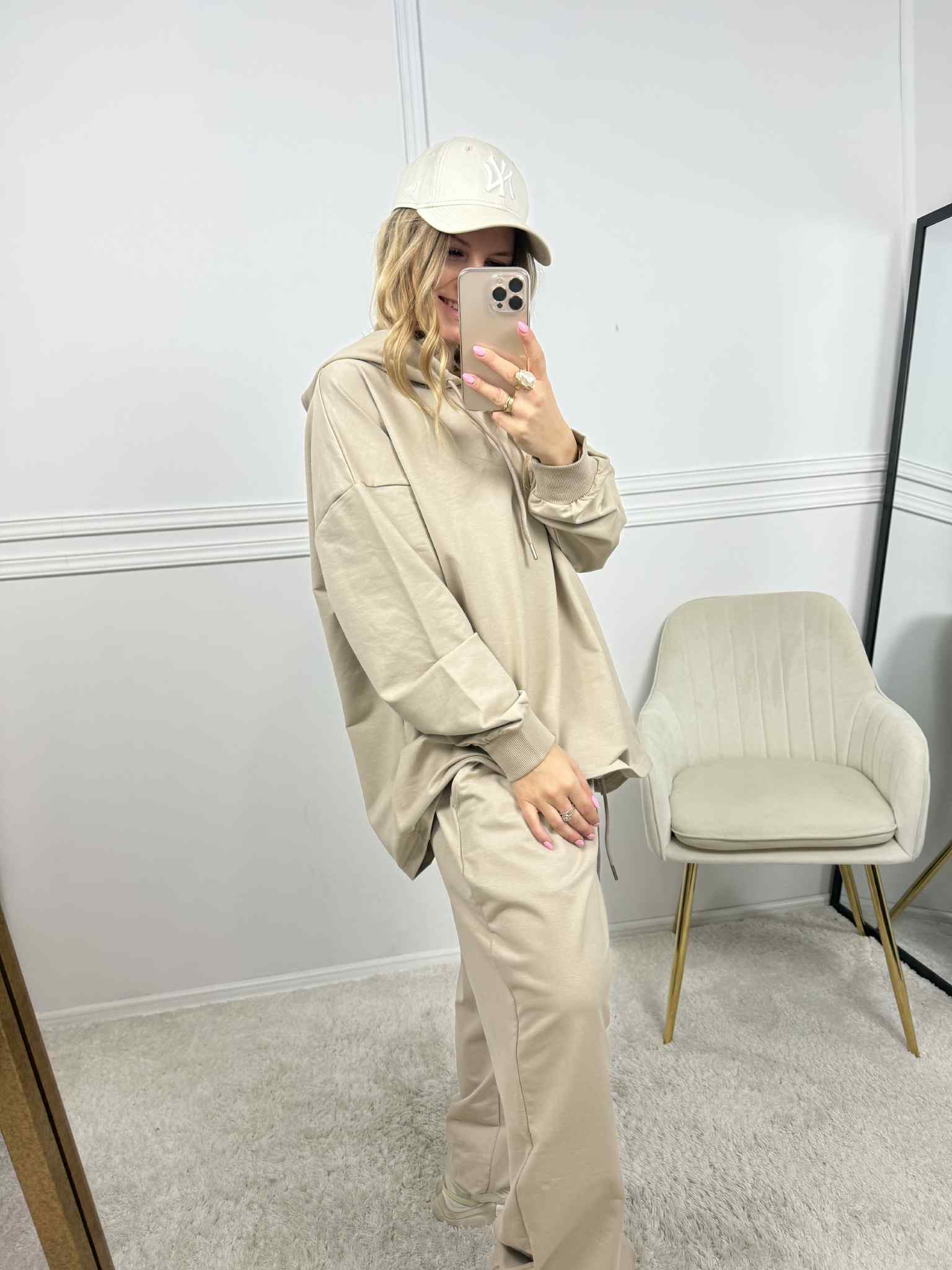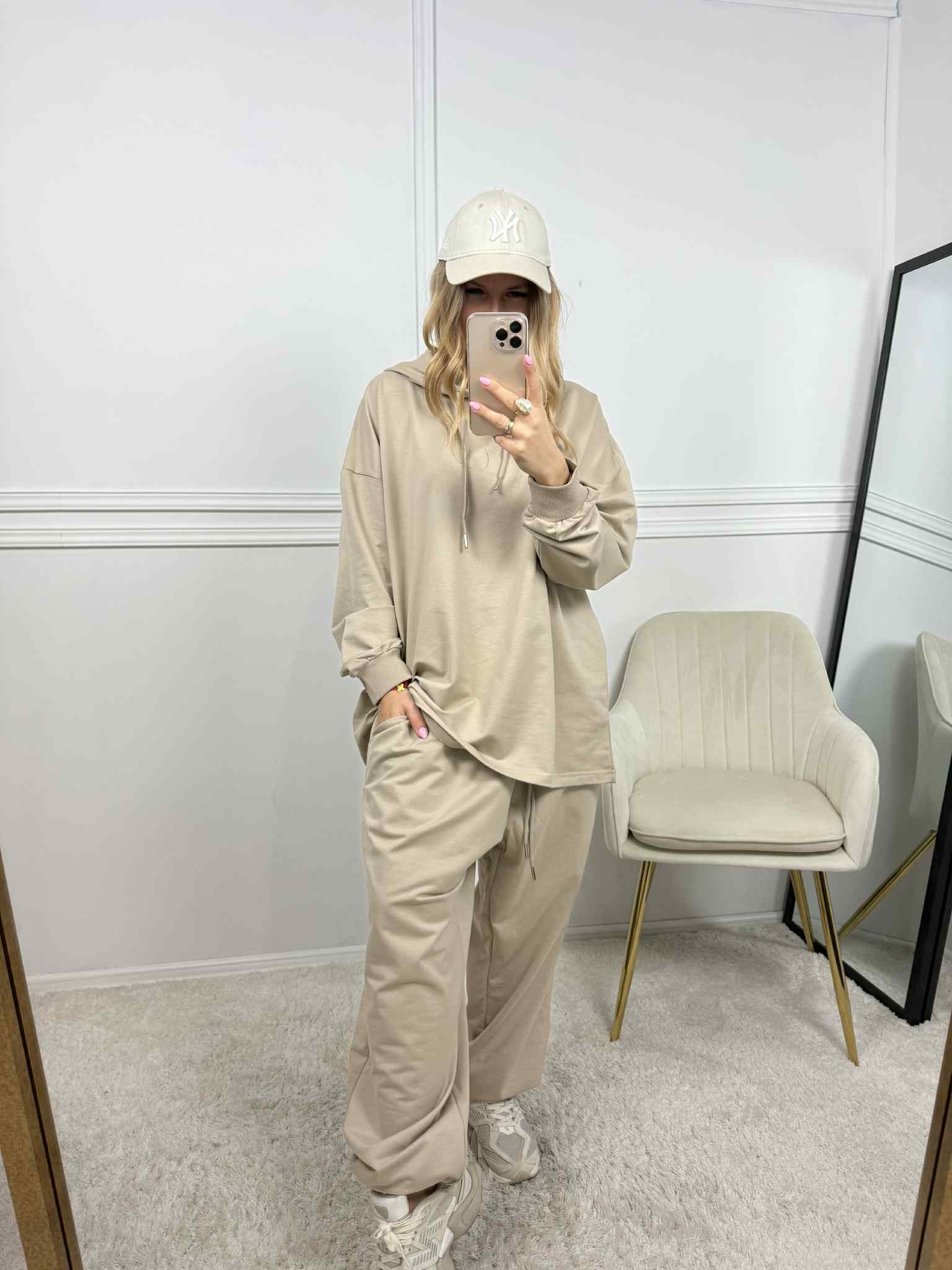 Komplet bawełniany o kroju oversize. Bluza z kapturem z ozdobnymi troczkami. Spodnie z wiązaniem w pasie, posiadają kieszenie. Spodnie zakończone gumką. Komplet nie jest ocieplany. Idealnie sprawdzi się na co dzień czy rodzinny wypad.