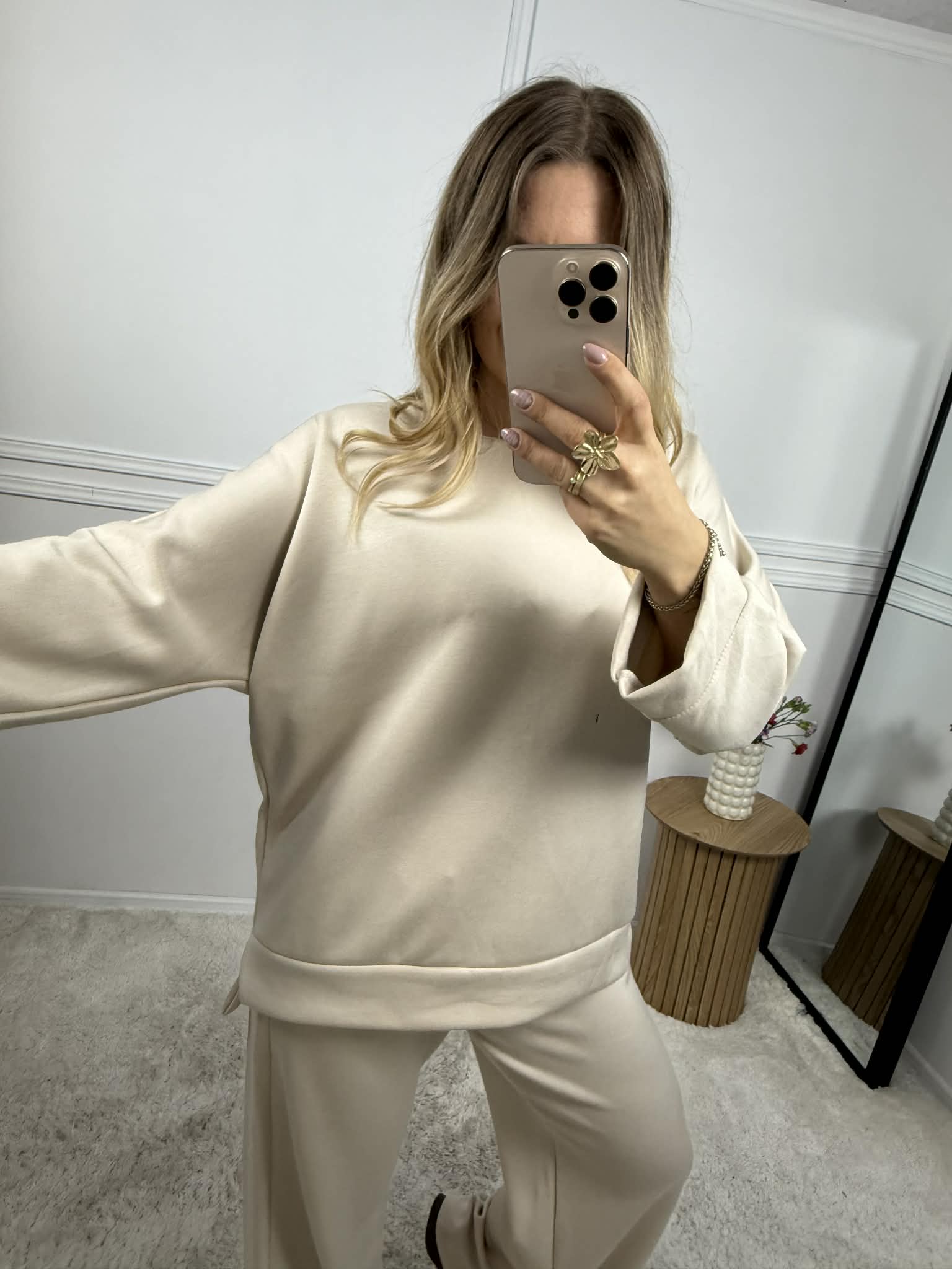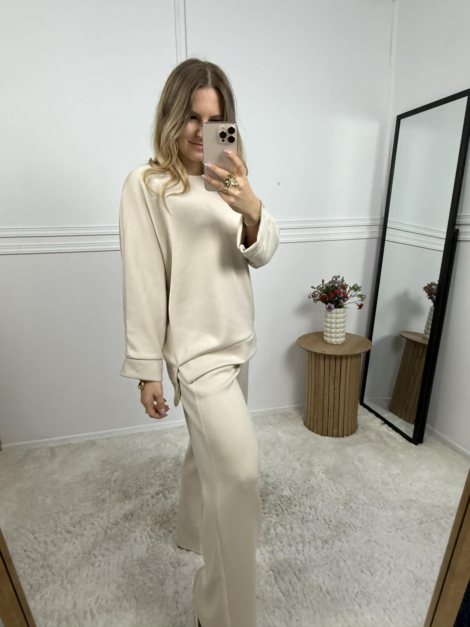 Komplet dresowy damski wykonany z tzw "masełka". Bluza o delikatnym kroju nietoperza. Spodnie na elastycznej gumie o szerokim kroju, posiadają kieszenie. Całość w stylu Basic bez nadruków.