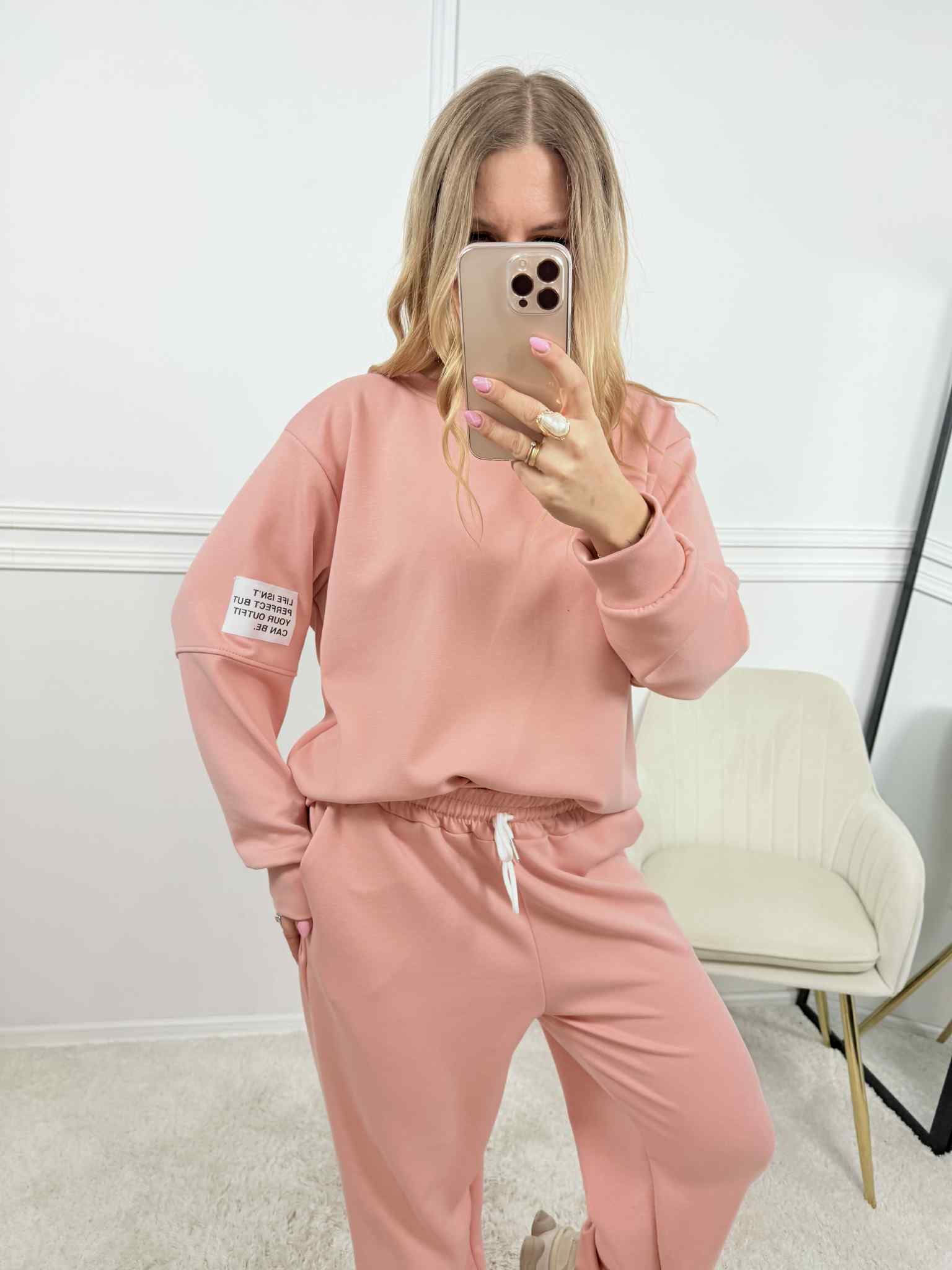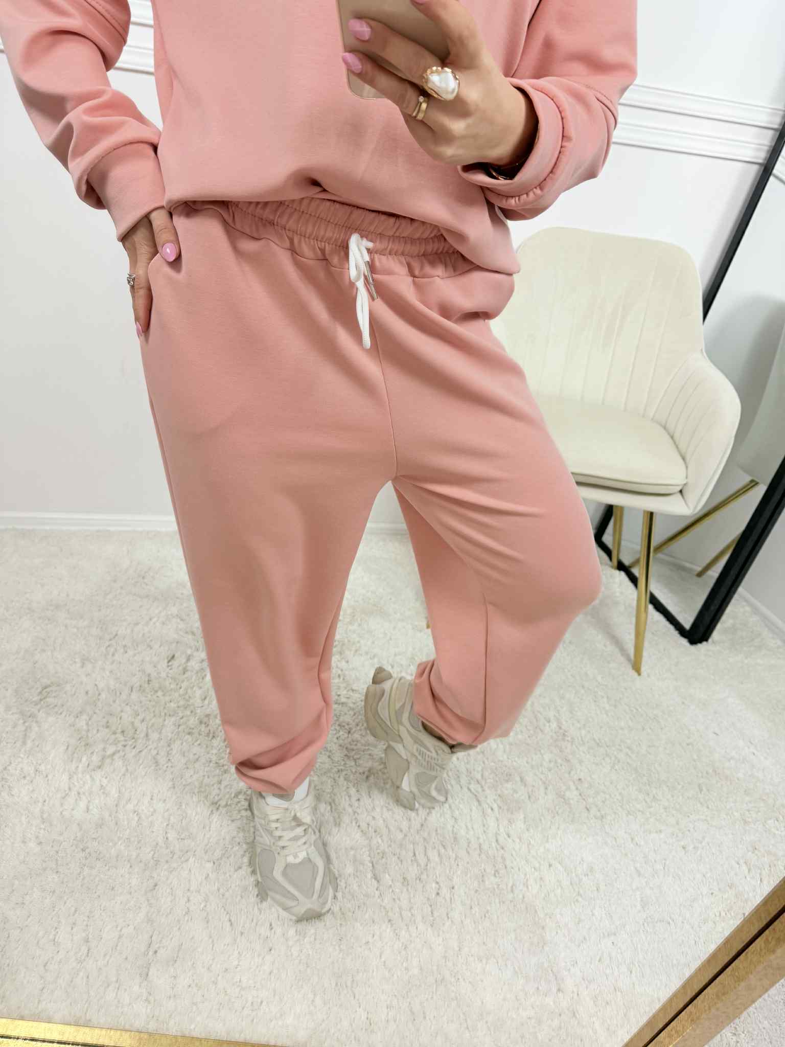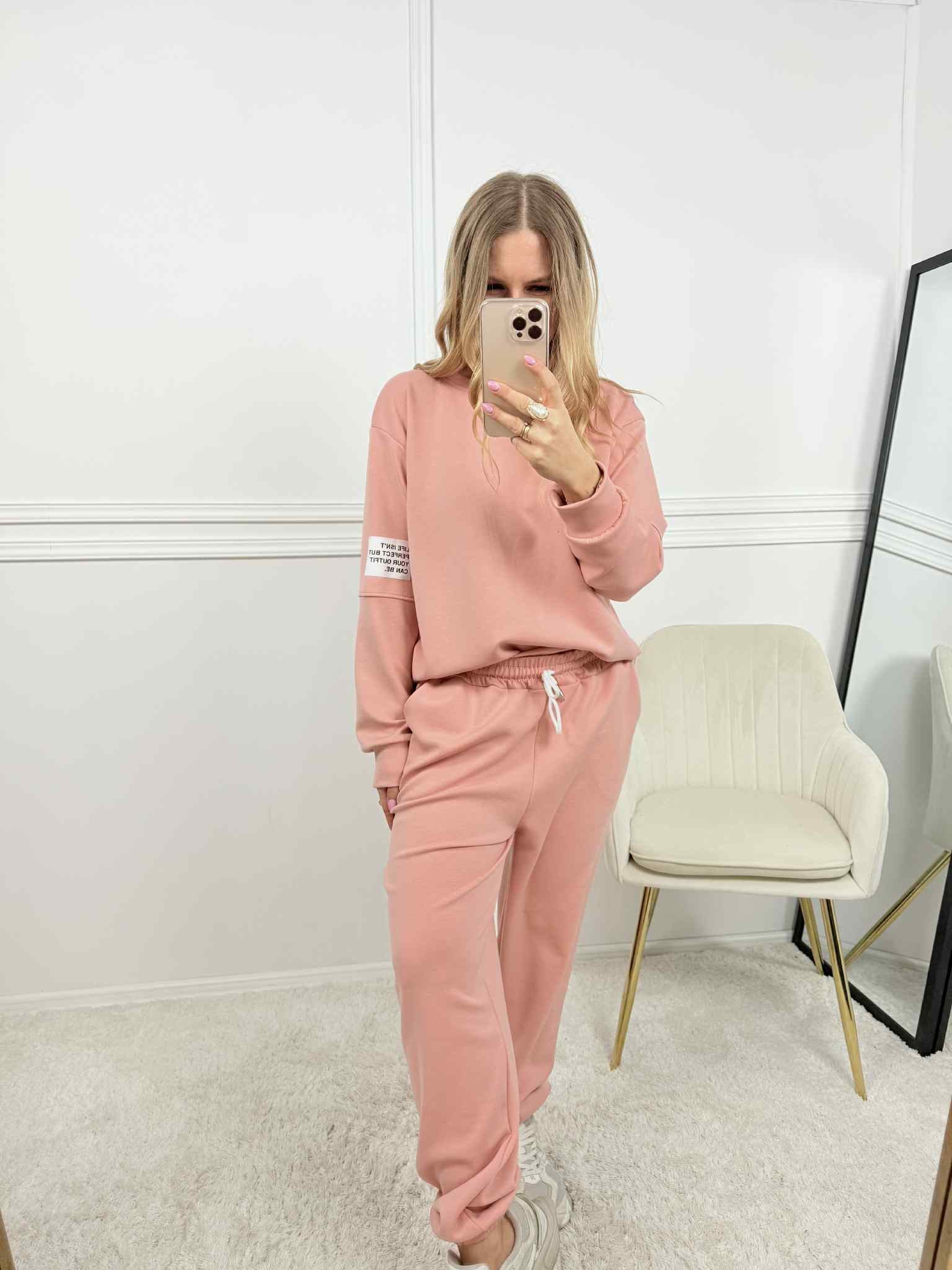 Komplet damski złożony z bluzy bez kaptura z naszywką na ramieniu. Mega miękki i miły w dotyku materiał. Spodnie są na gumce z dodatkowym wiązaniem, posiadają kieszenie i ściągacz na dole. Absolutny hit na nadchodzący sezon w pięknych kolorach. Komplet nie jest ocieplany, ale nie jest cienki.
