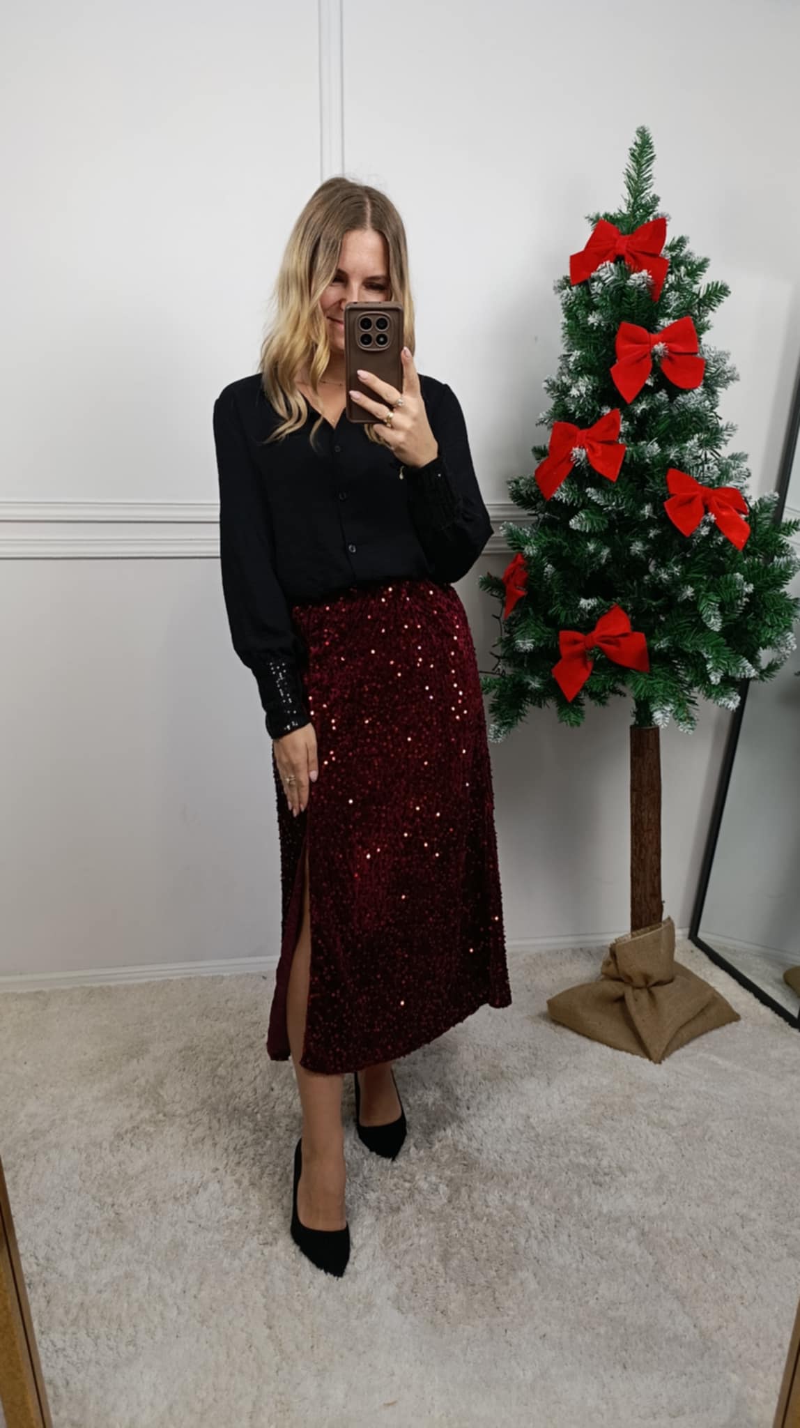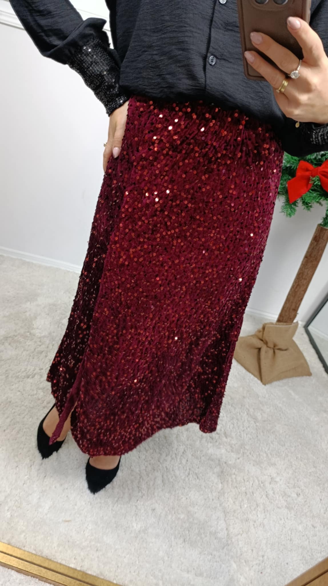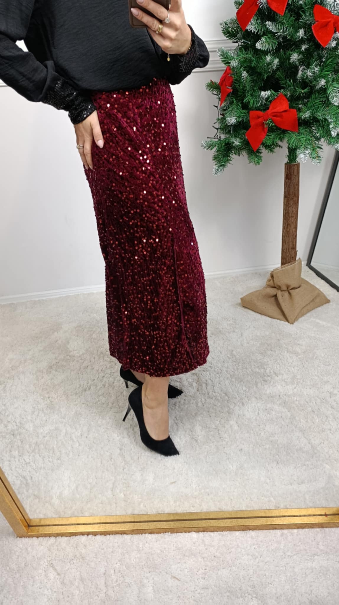 Spódnica na gumce o cekinowym wykończeniu. Długość midi i delikatne rozcięcie na boku. Na żywo prezentuje się fenomenalnie. Sprawdzi się idealnie na różnego rodzaju święta, imprezy czy domówkę.