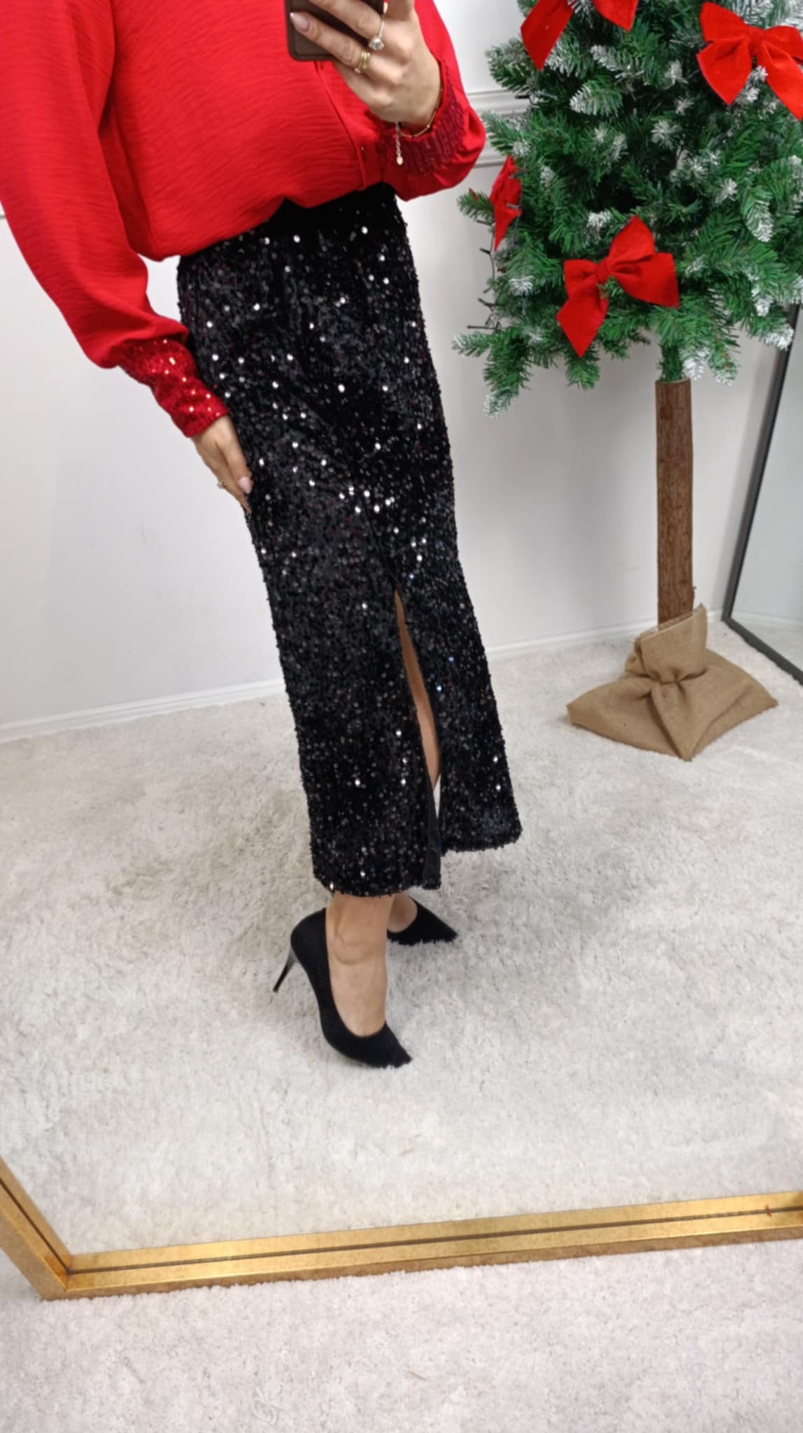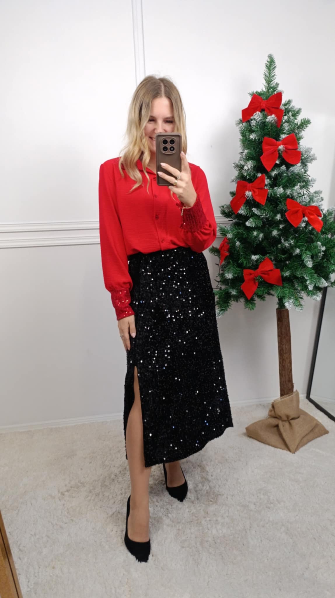 Spódnica na gumce o cekinowym wykończeniu. Długość midi i delikatne rozcięcie na boku. Na żywo prezentuje się fenomenalnie. Sprawdzi się idealnie na różnego rodzaju święta, imprezy czy domówkę.