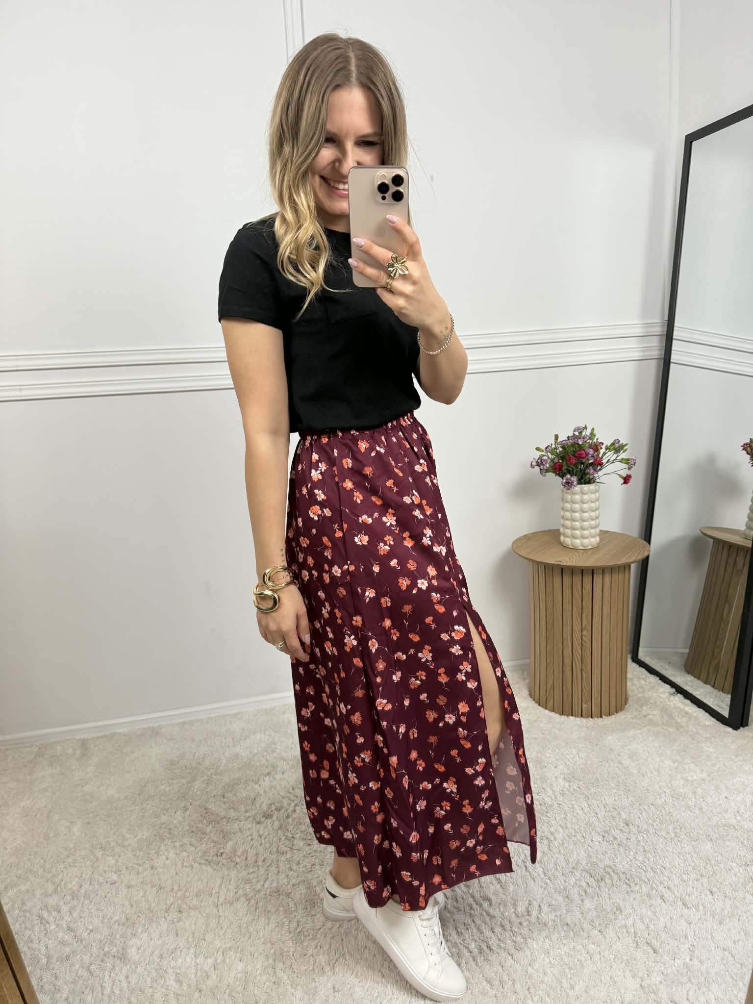 Spódnica o długości midi na gumce z delikatnym rozcięciem. Idealna na co dzień, ale i na wyjście. Można nosić z sneakersami, klapkami czy szpilkami.