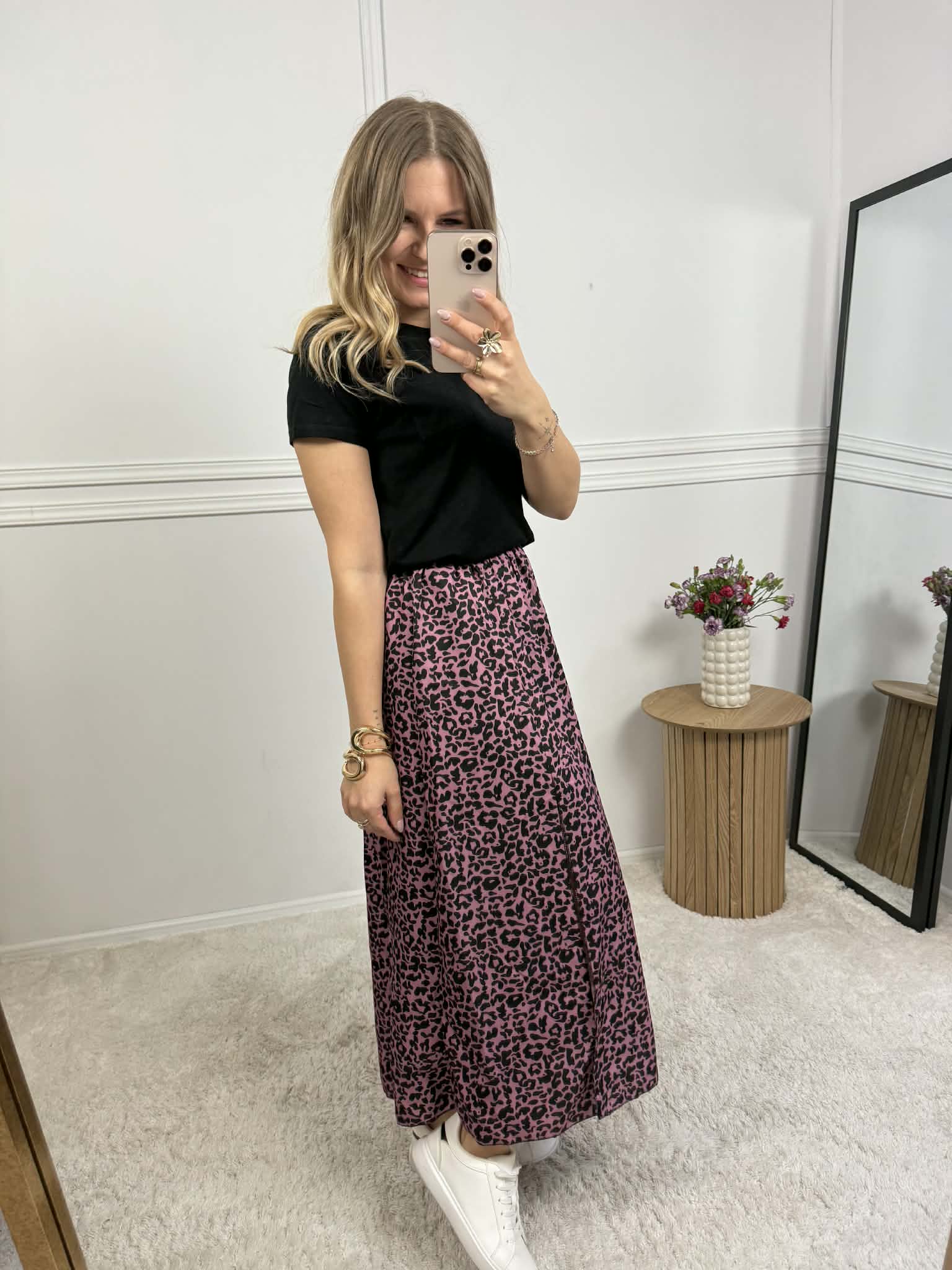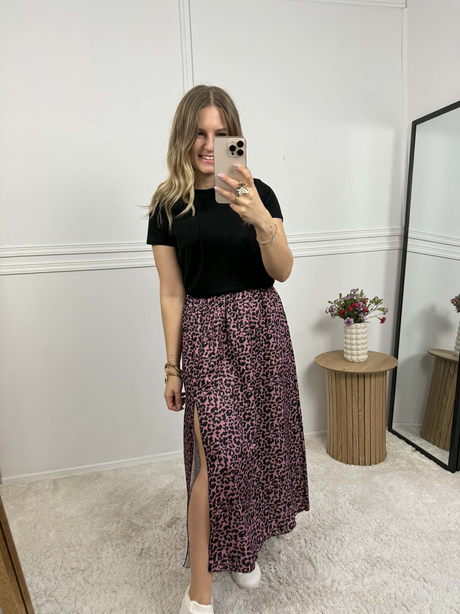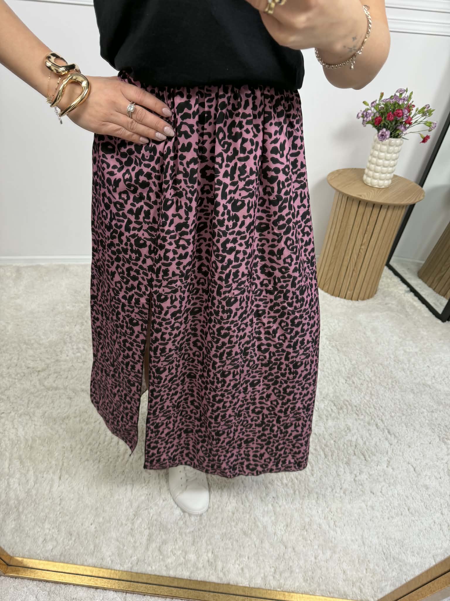 Spódnica o długości midi na gumce z delikatnym rozcięciem. Idealna na co dzień, ale i na wyjście. Można nosić z sneakersami, klapkami czy szpilkami.