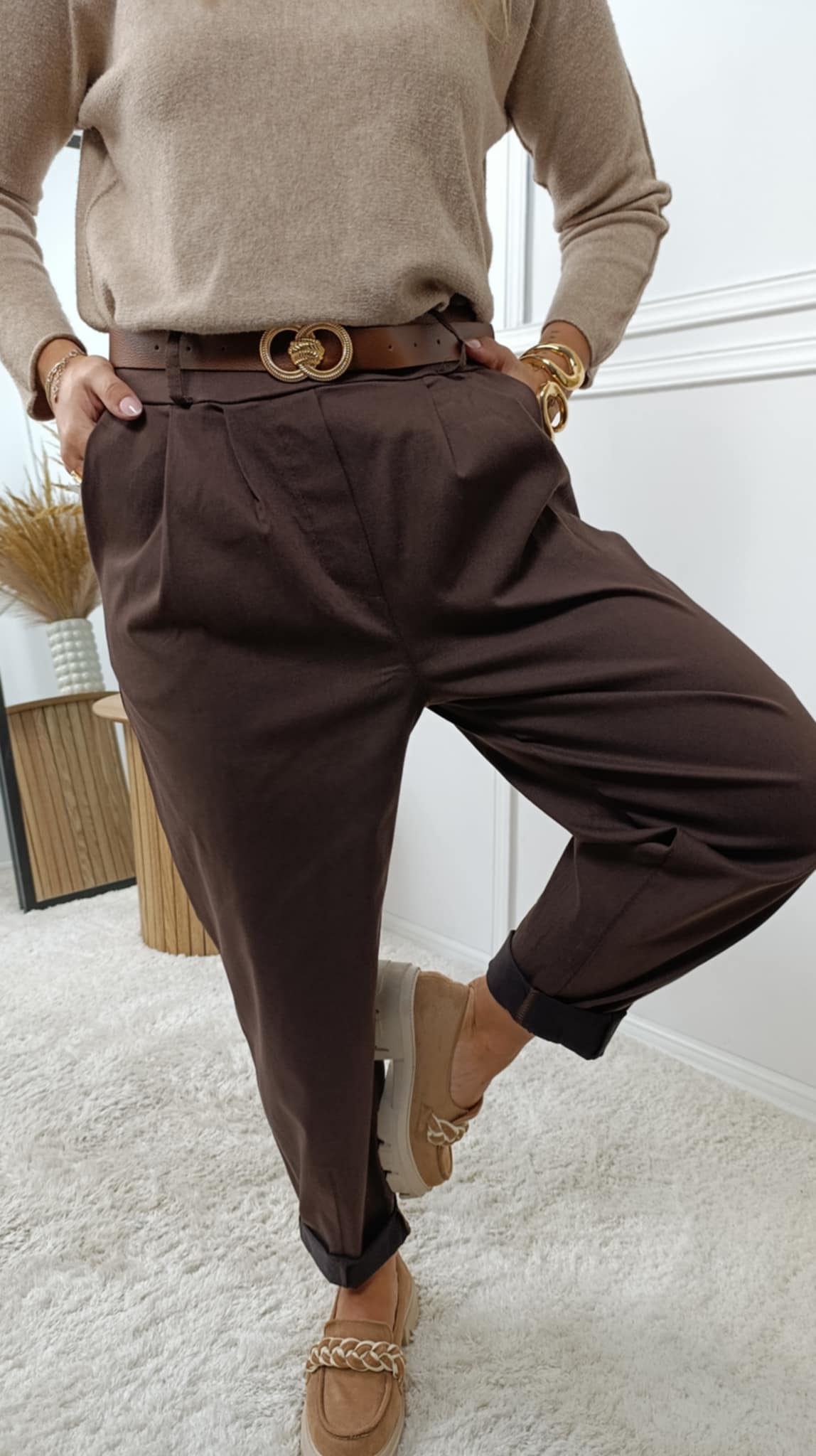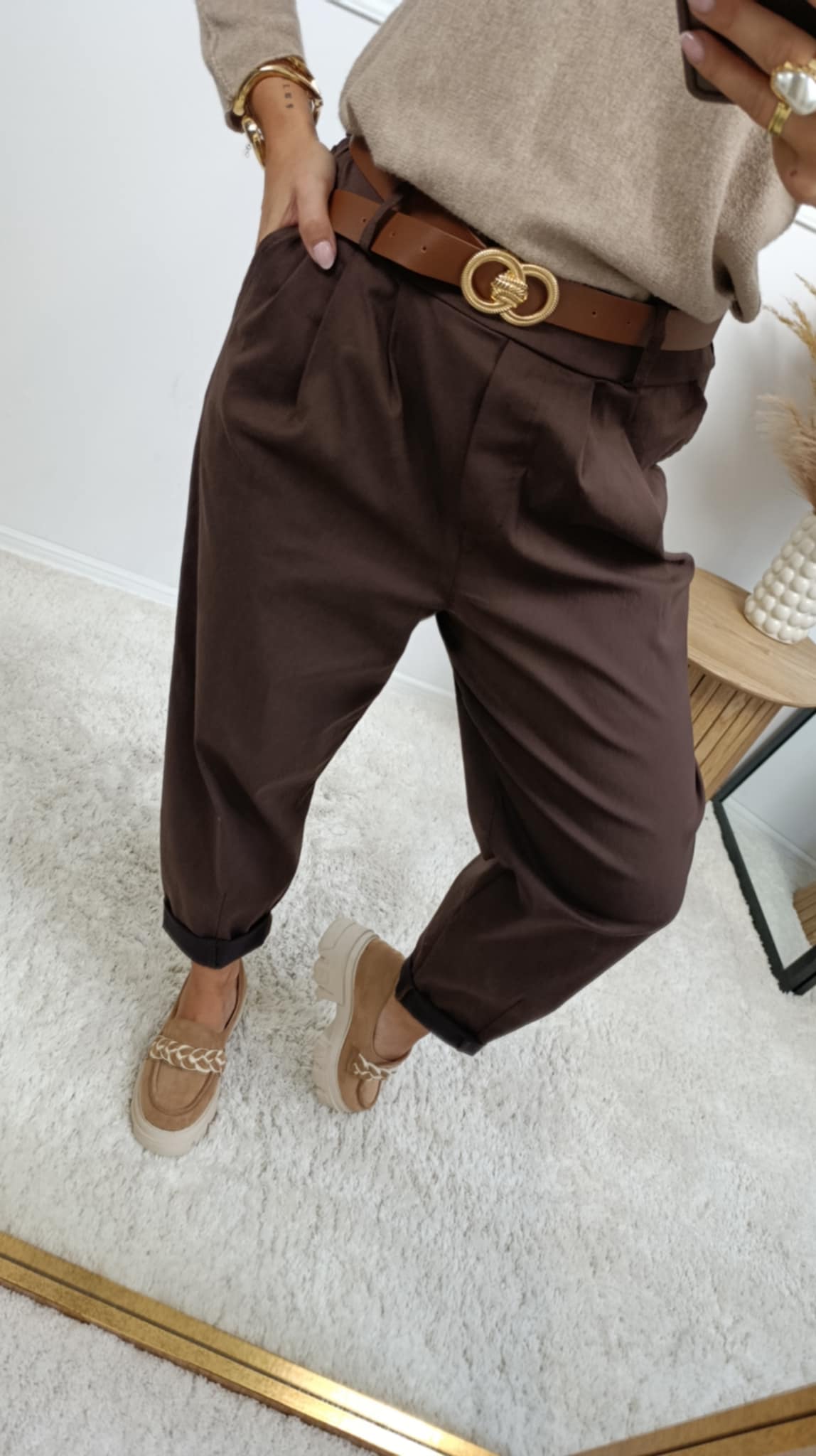 Elastyczne spodnie na gumce z paskiem w zestawie. Spodnie posiadają kieszenie z przodu i z tyłu. Sprawdzą się na co dzień i na eleganckie wyjście. Bardzo modny krój baggy.