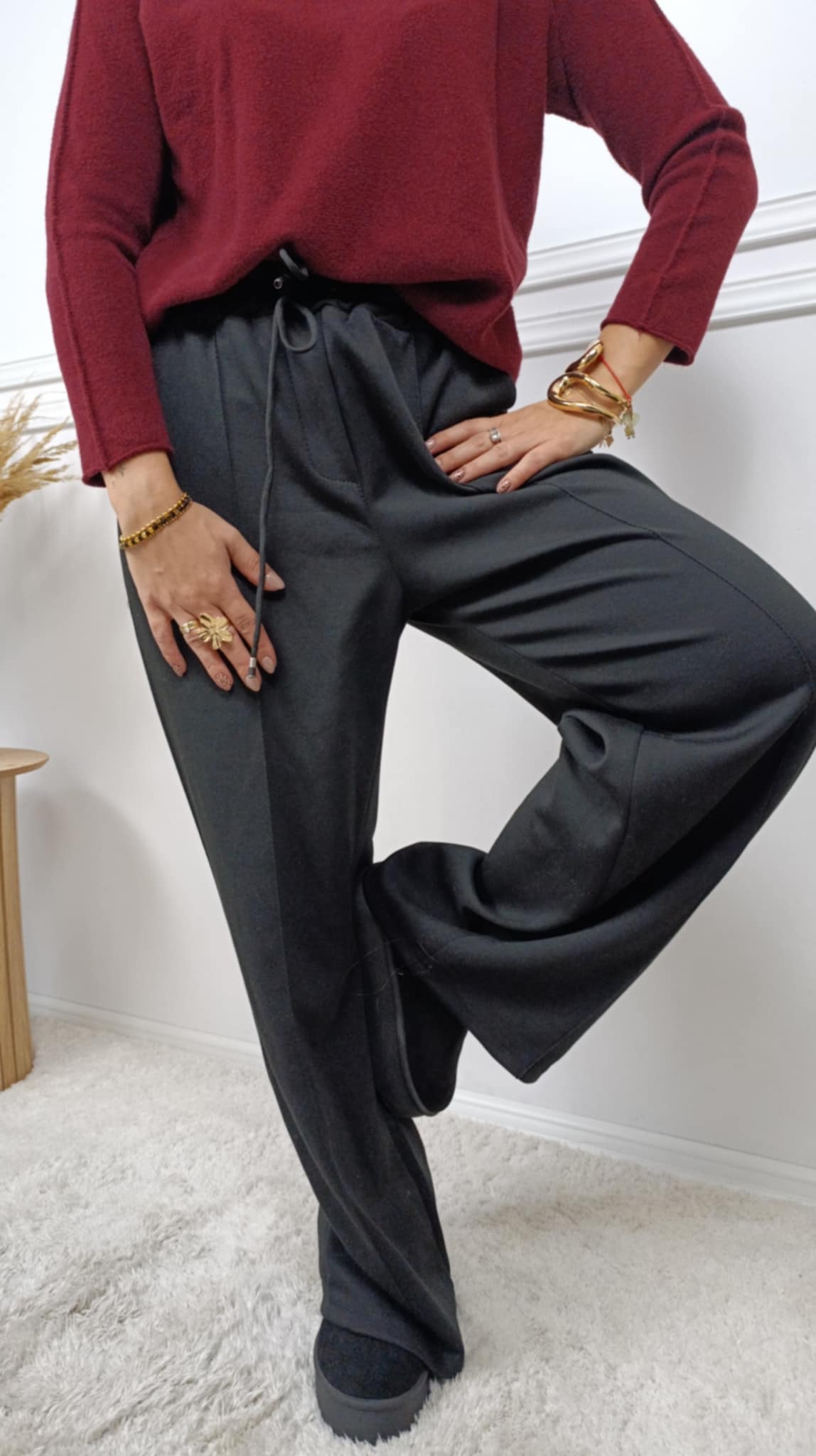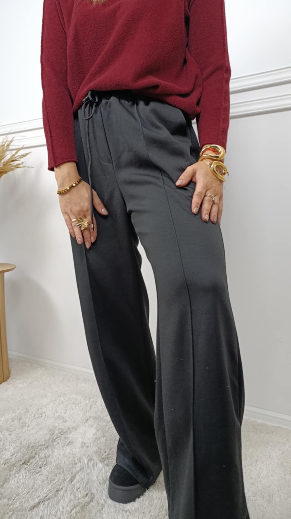 Elastyczne spodnie na gumce o szerokim kroju. Spodnie posiadają kieszenie. Z przodu delikatne przeszycia.