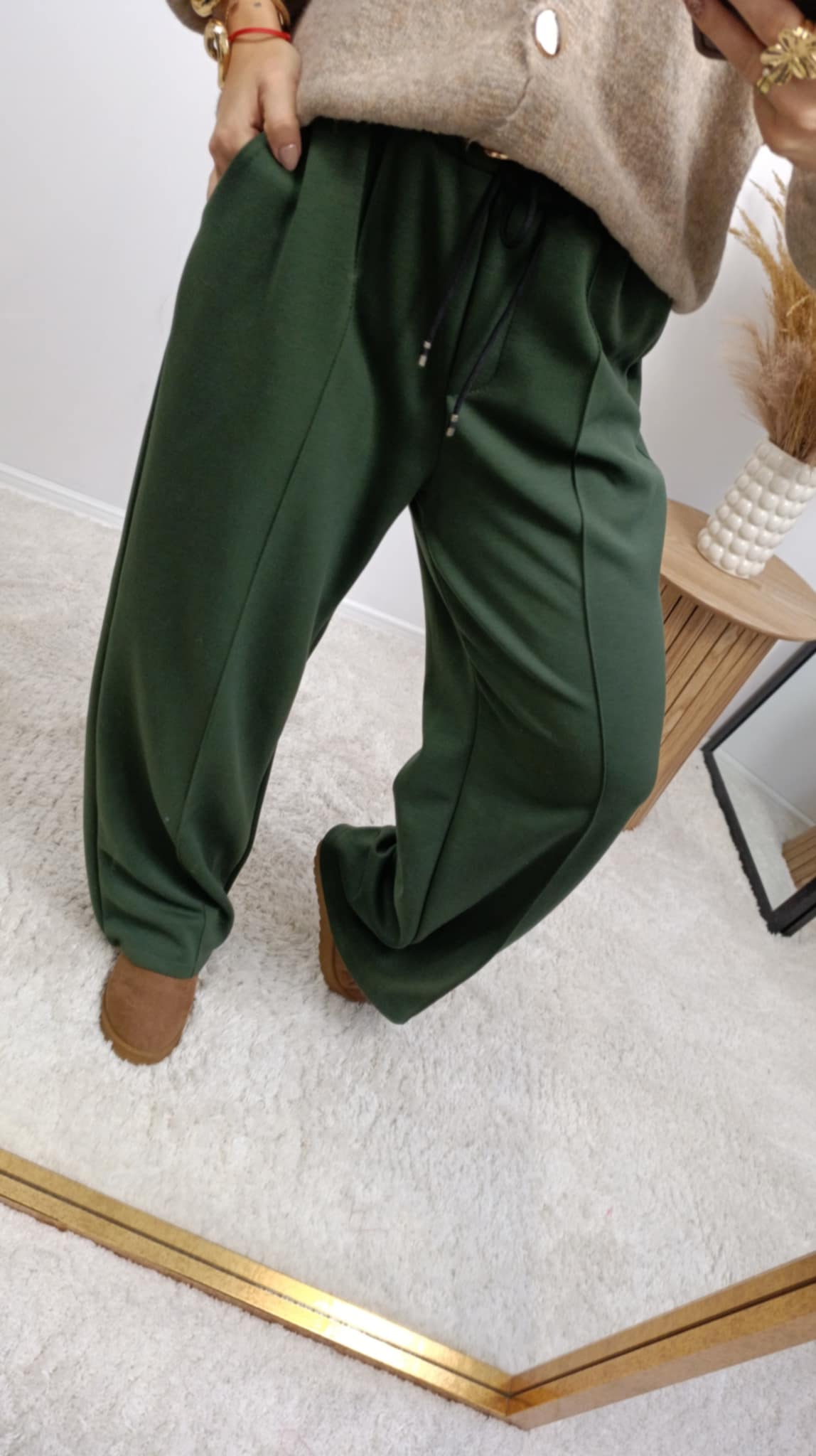 Elastyczne spodnie na gumce o szerokim kroju. Spodnie posiadają kieszenie. Z przodu delikatne przeszycia.