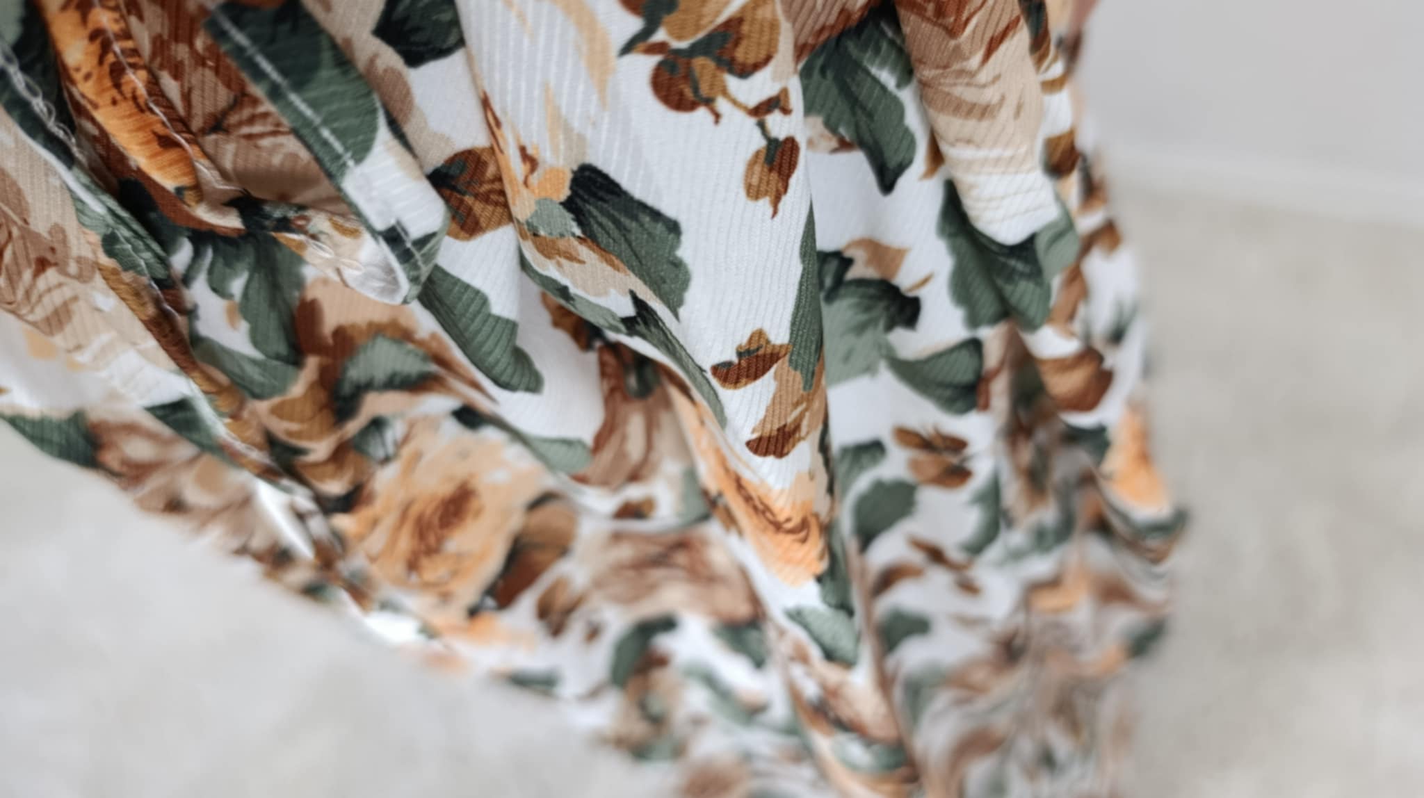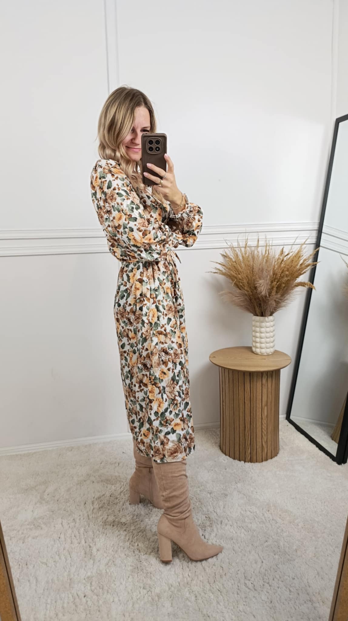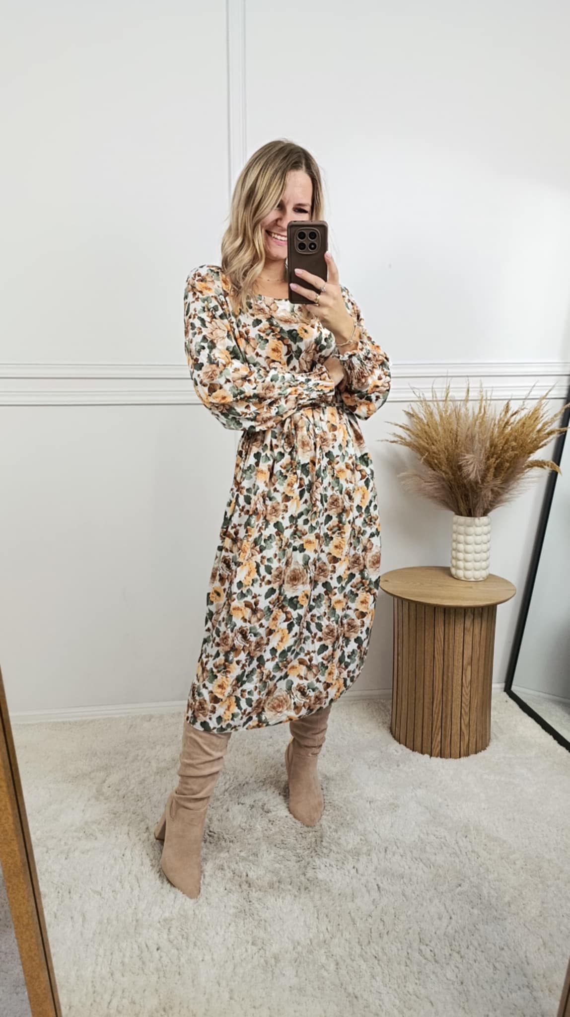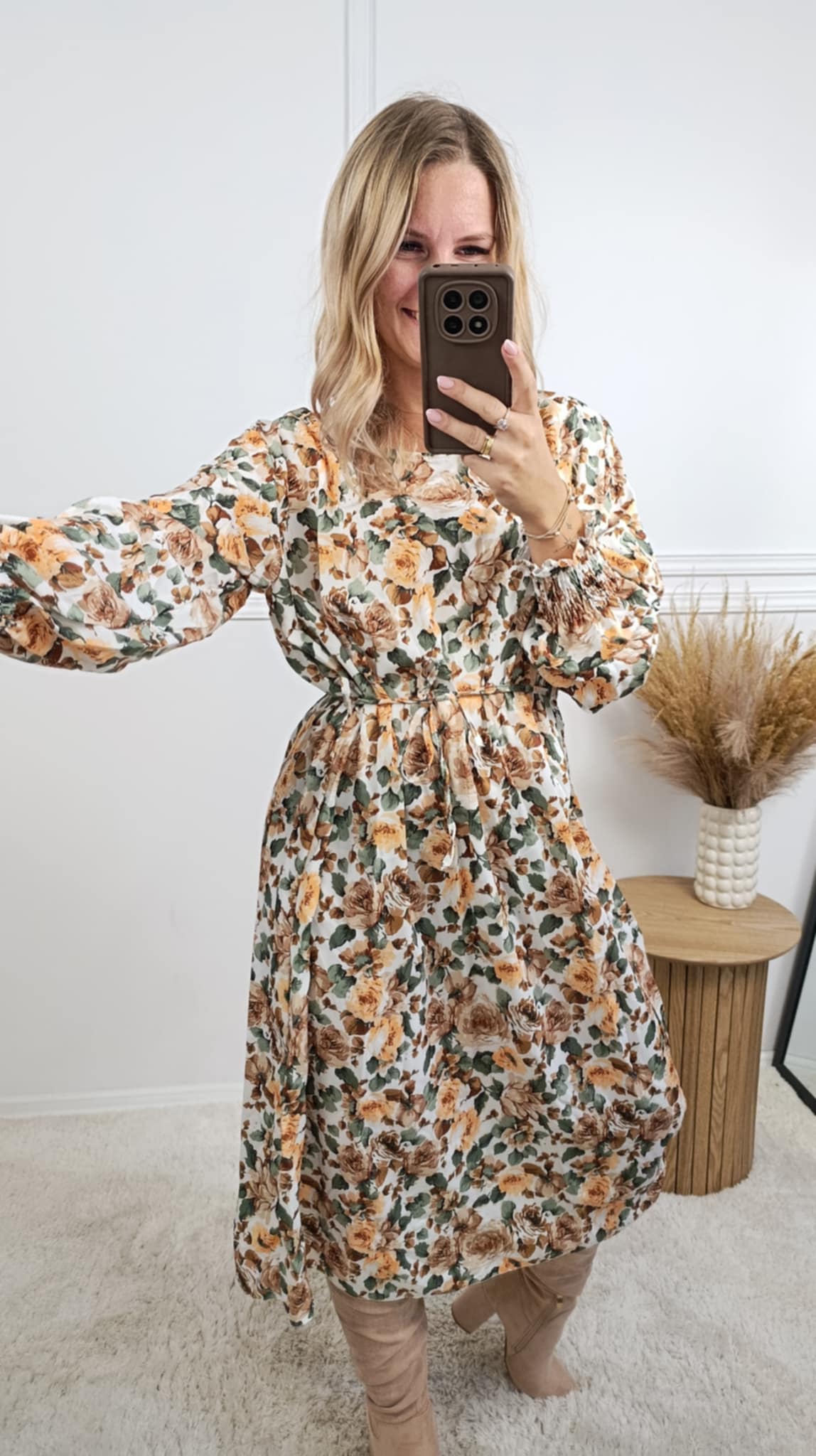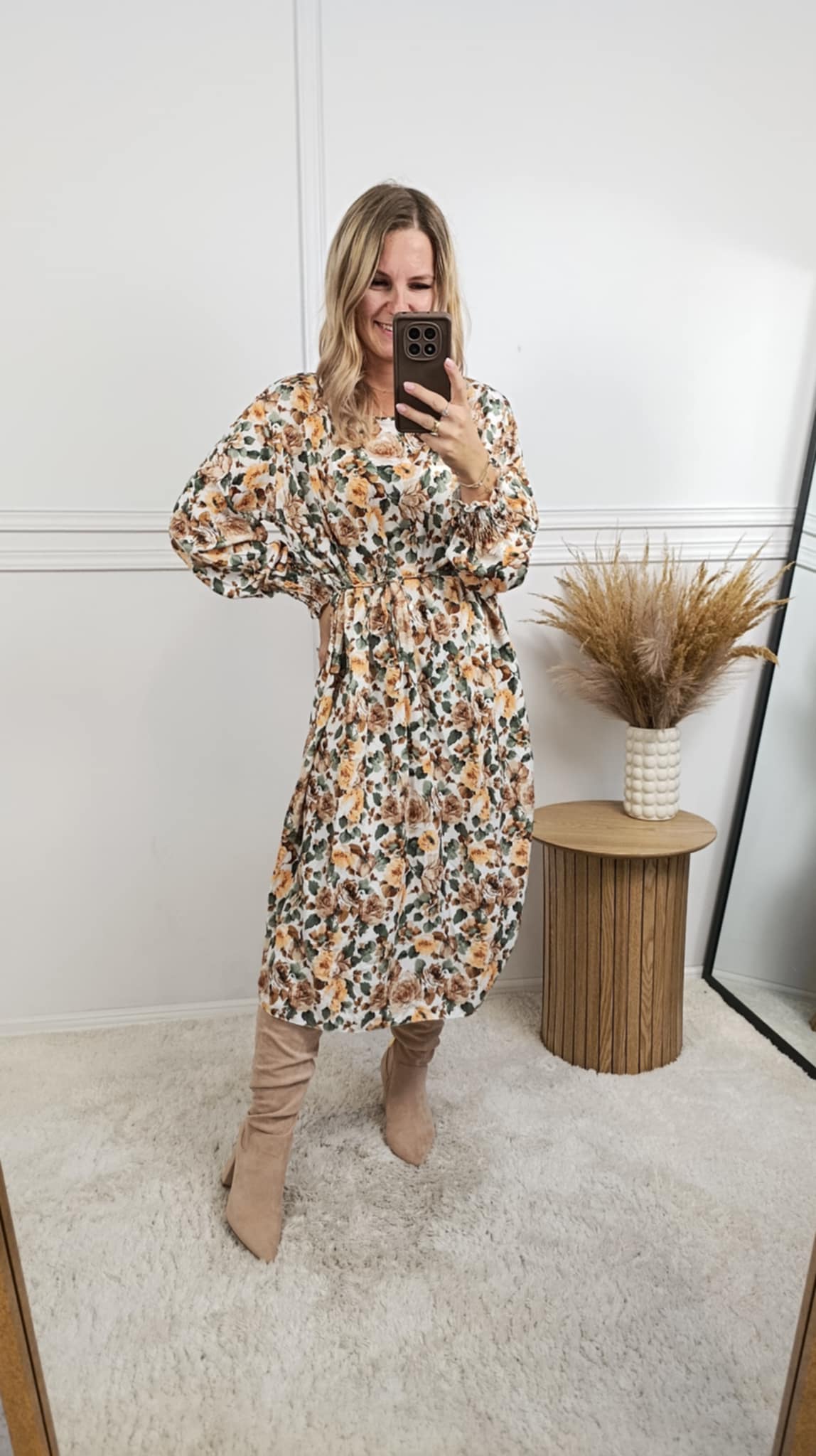 Sukienka o długości midi o prostym kroju. W talii pasek do regulacji. Długi rękaw wykończony mankietem z gumką. Materiał delikatnie ryflowany. Piękna, jesienna kolorystyka.