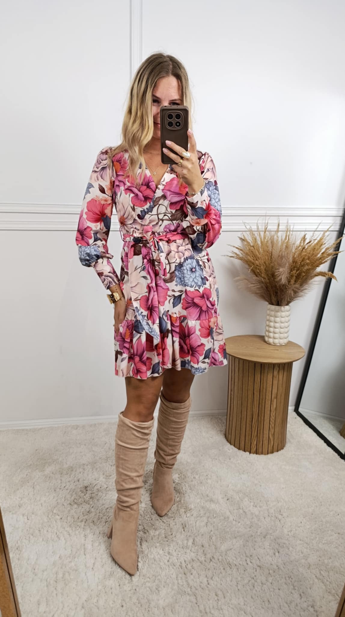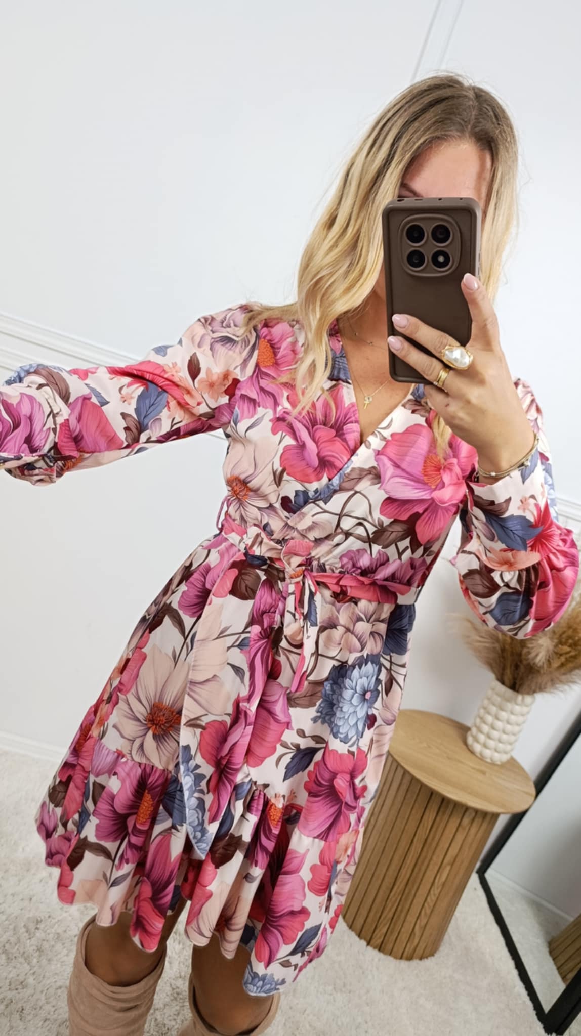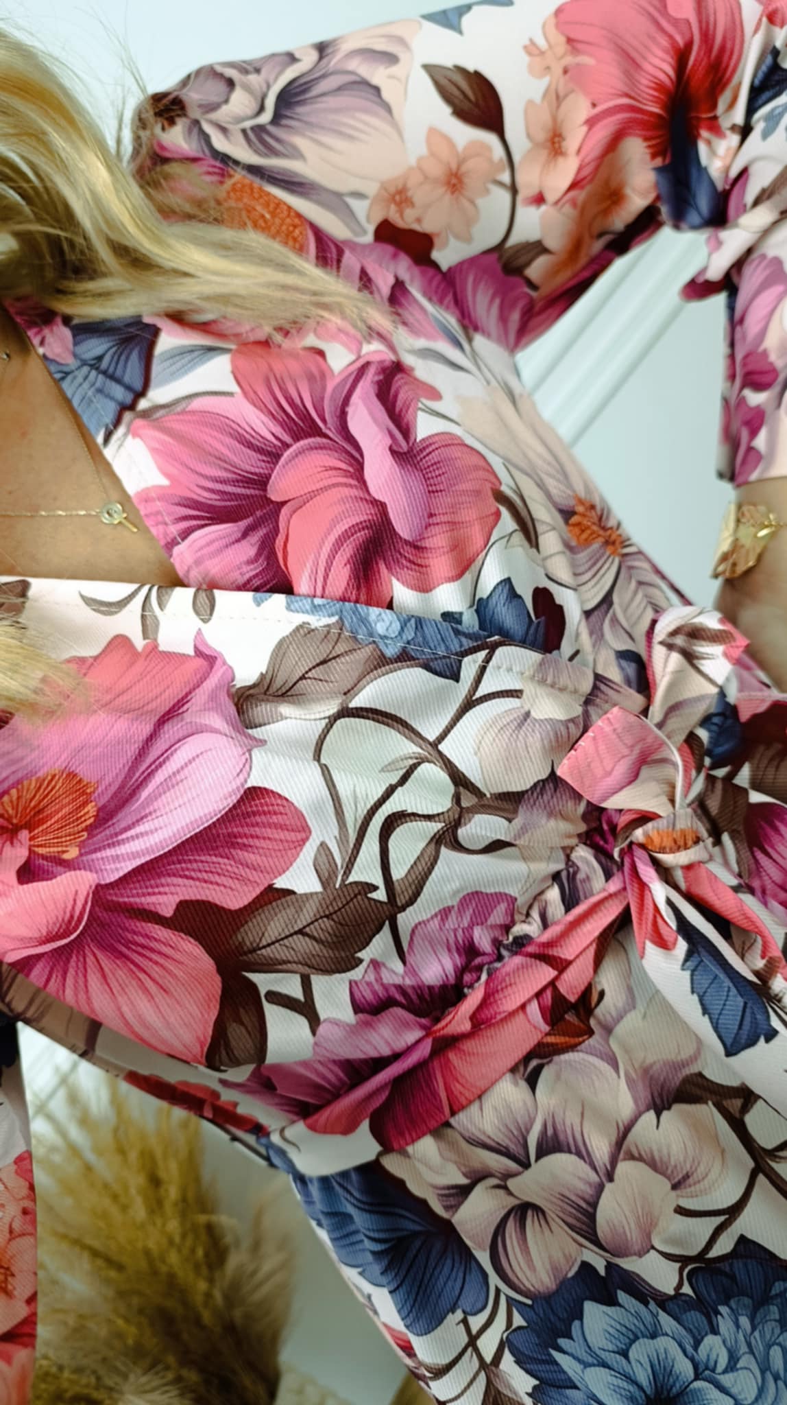 Sukienka z dekoltem kopertowym w pięknym kwiatowym princie. W talii elastyczna gumka oraz pasek do ozdoby. Sukienka świetnie się układa. Idealna na wiele okazji.