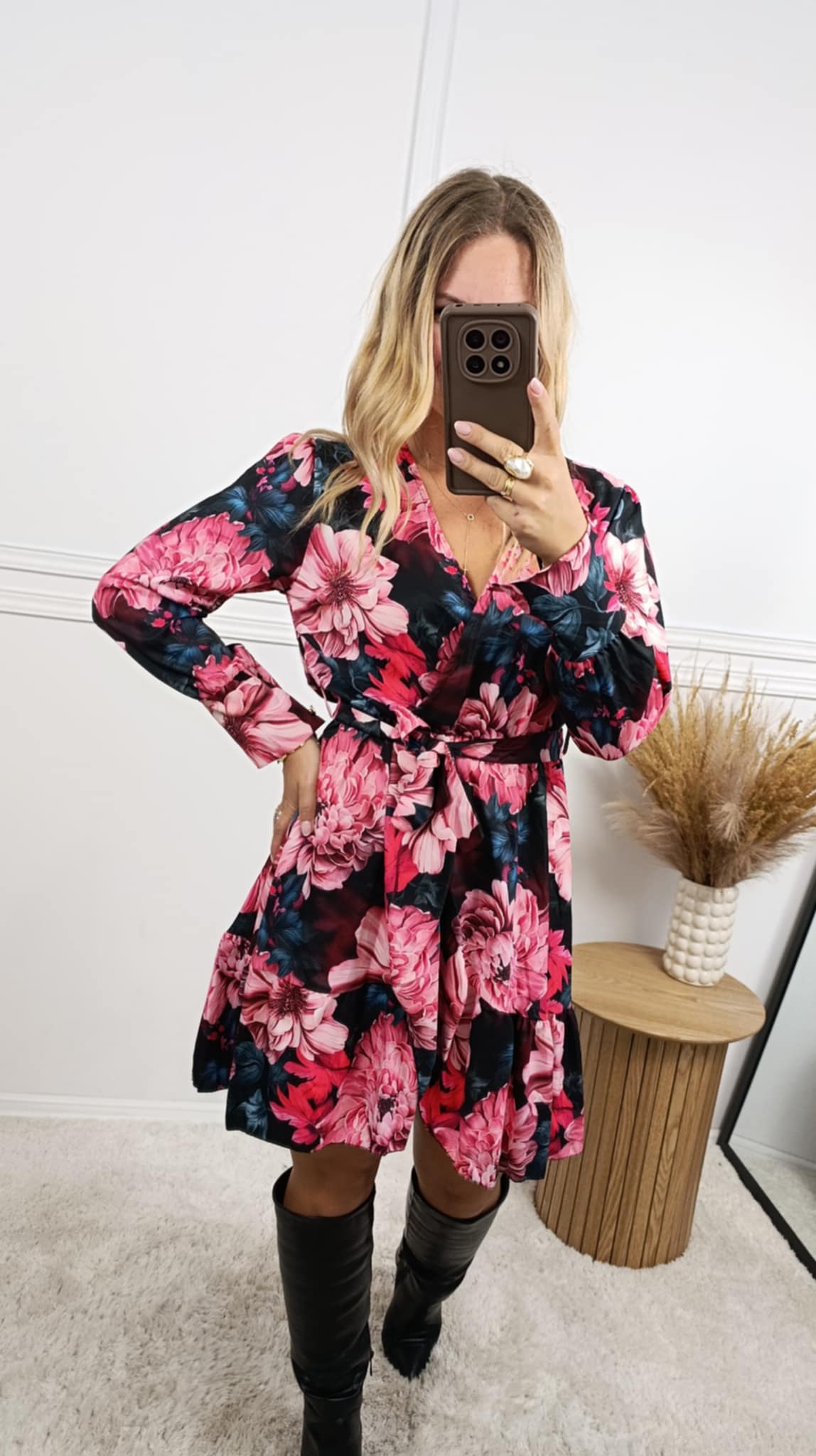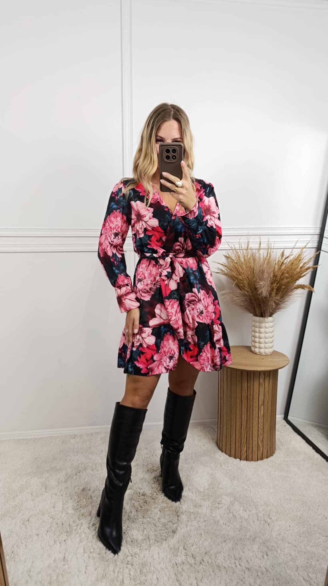 Sukienka z dekoltem kopertowym w pięknym kwiatowym princie. W talii elastyczna gumka oraz pasek do ozdoby. Sukienka świetnie się układa. Idealna na wiele okazji.