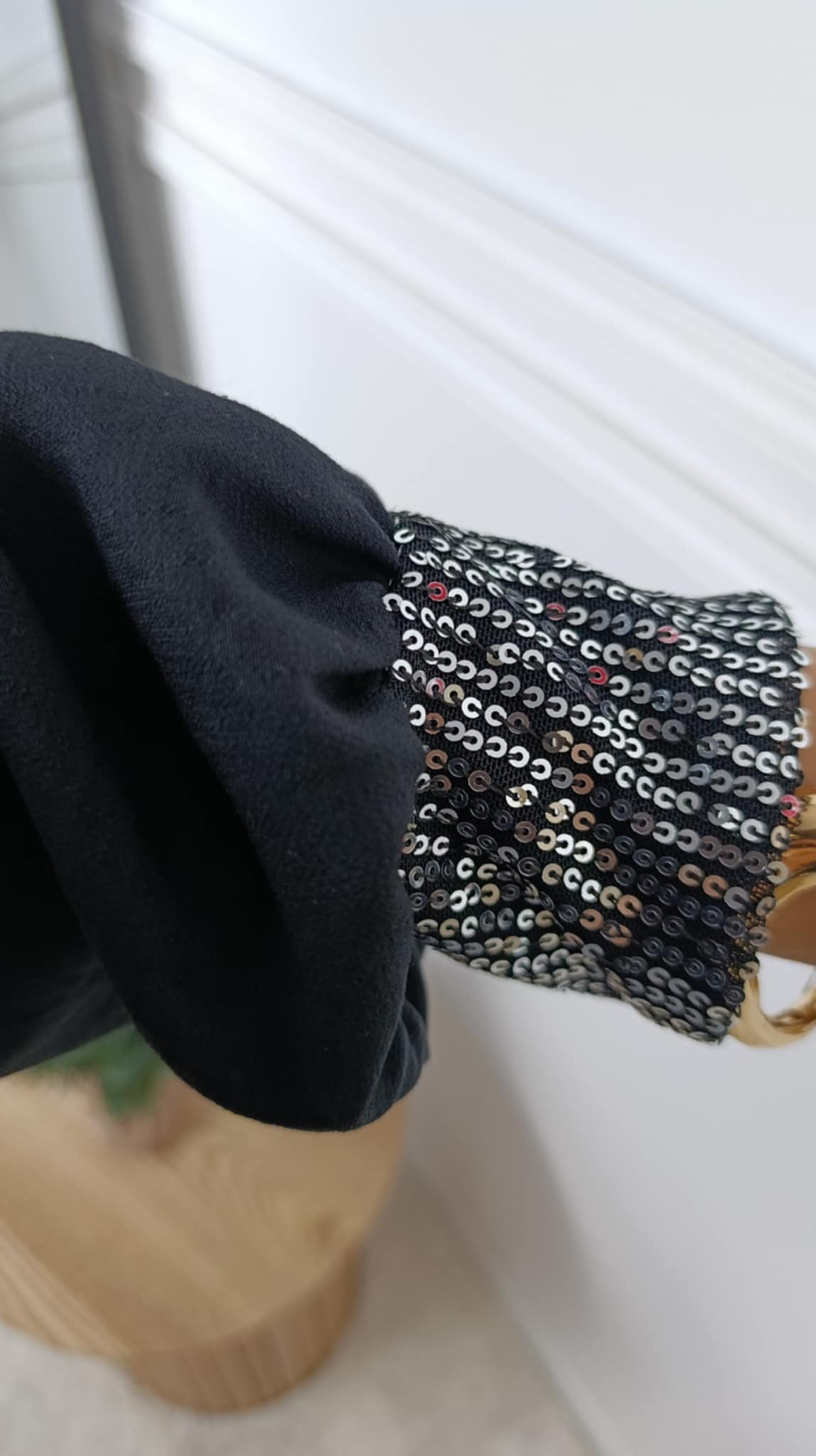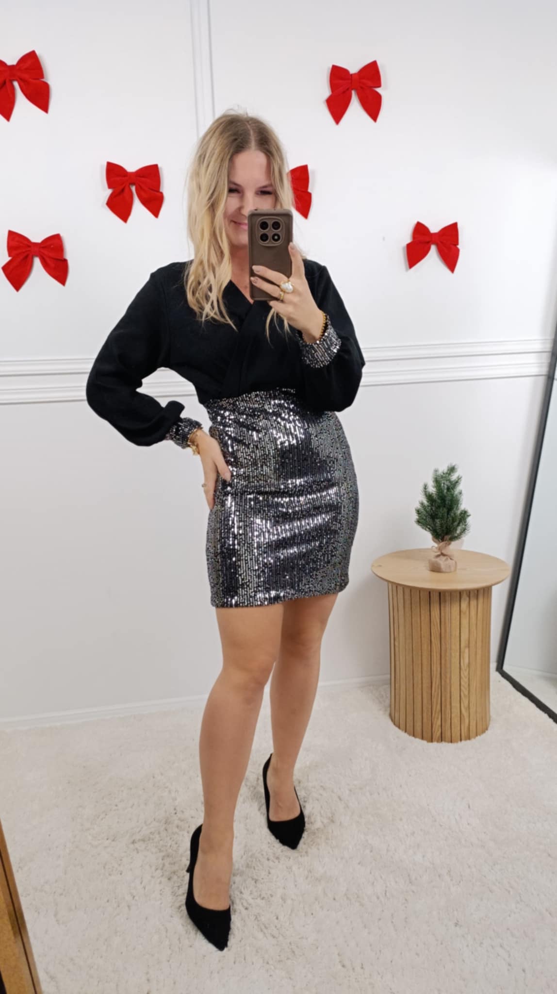 Sukienka elegancka z dekoltem kopertowym. Rękawy delikatnie bufiaste wykończone cekinowym mankietem. Dół elastyczny wyszywany cekinami. Sprawdzi się świetnie na każdej imprezie.