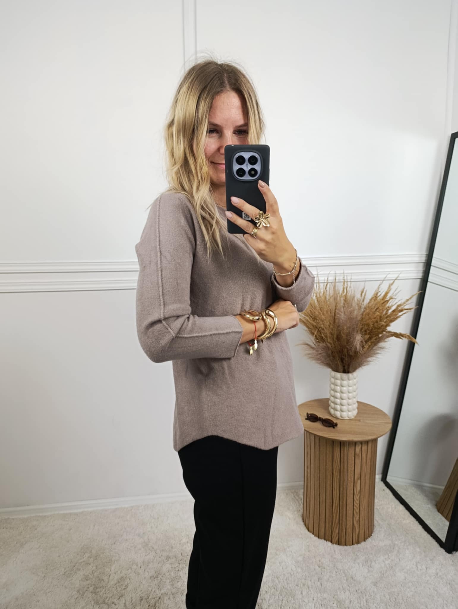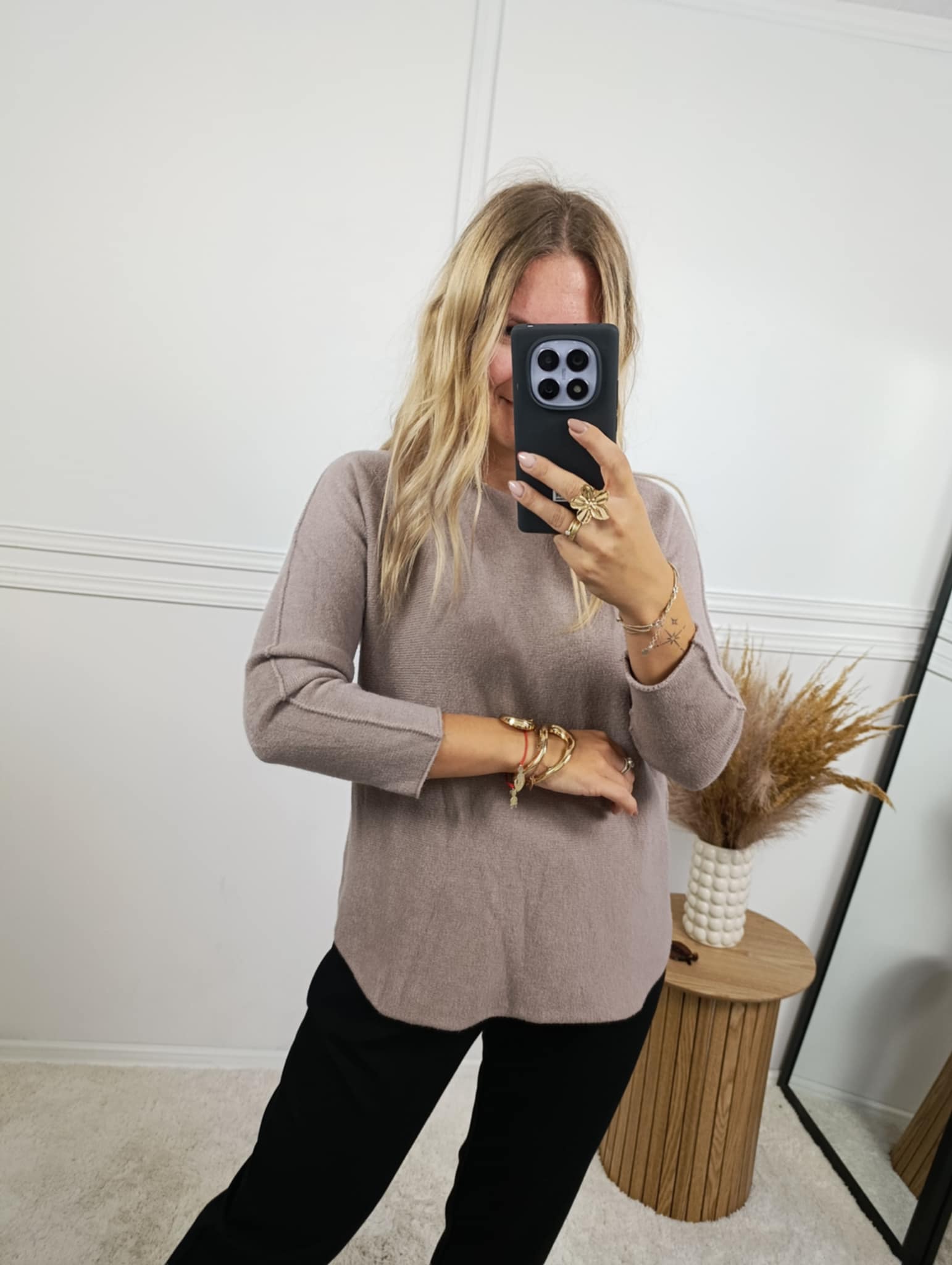 Sweter o dopasowanym kroju z długim rękawem. Miły w dotyku, nie gryzie. Sweter posiada dekolt w łódkę, a na rękawach ozdobne przeszycia.